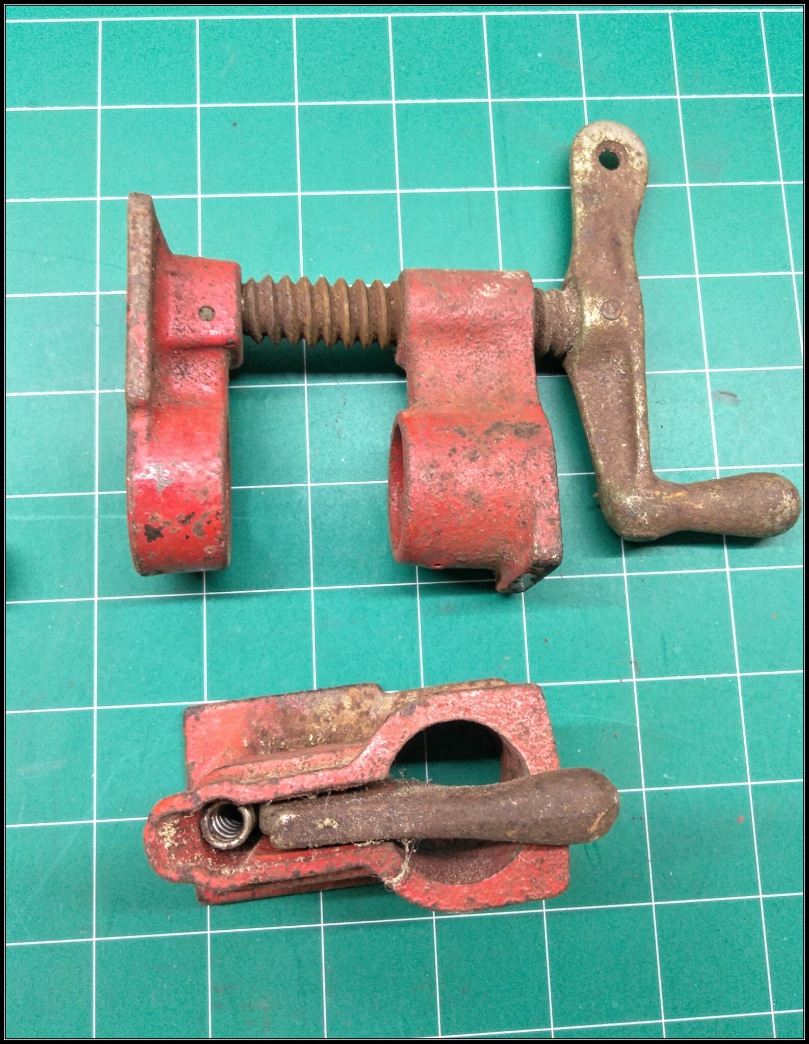 When I first came to own these two clamps about a year ago I'd say, I gave them an initial quick once over on the wire wheel just to see if I could get them to function again. And they sat unused because quite honestly - I hate using tools that are all rusted up or covered in grease etc. It gets all over your hands, in the finish, in the wood or what ever it is you are working on. So they got set aside till I could bring them back to working order properly. And they rusted up again... but not nearly as bad as when I first acquired them. I was smart enough to doise them with a healthy dose of penetrating oil after the initial wire wheeling before sticking them in a box to be dealt with later. I point this out as the before pics are not nearly what they were when found amongst other rusting junk.